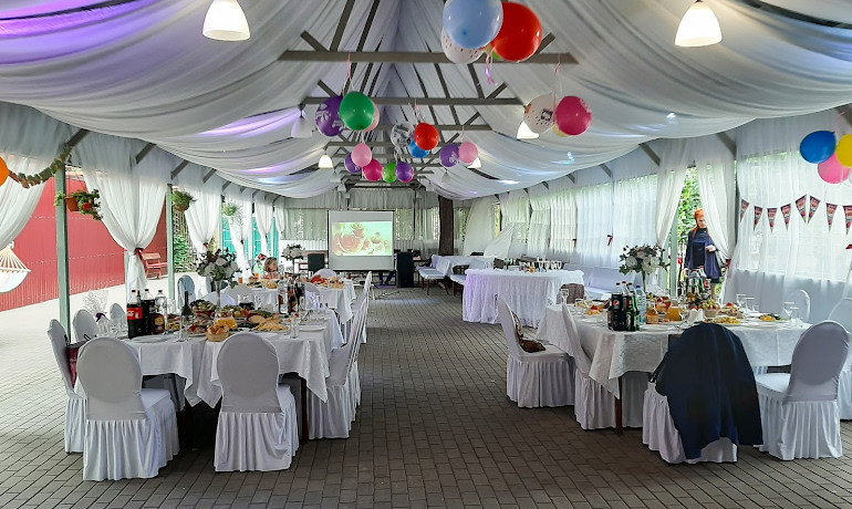 На территории нашего комплекса сооружена площадка для выездной регистрации и место для фотосессий. Летняя веранда полностью драпирована тканью.