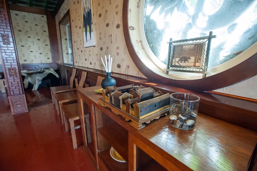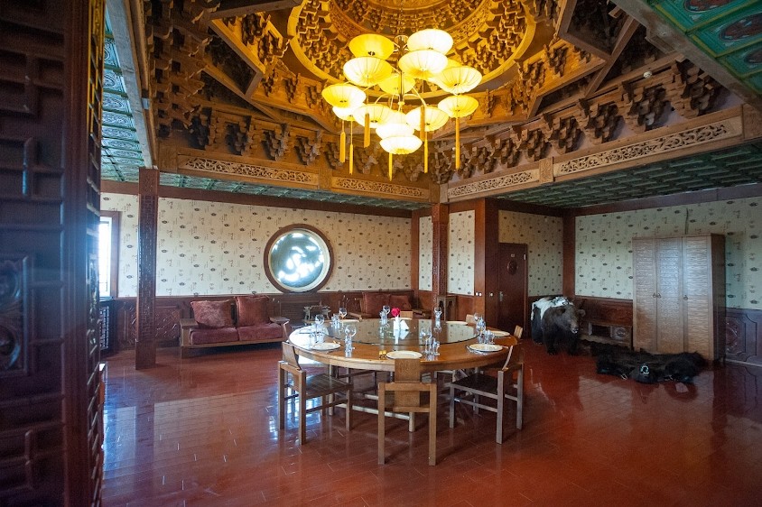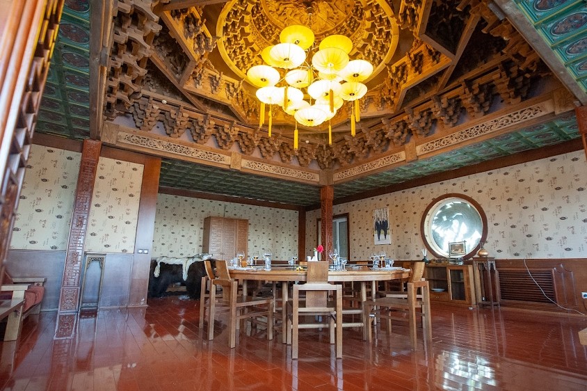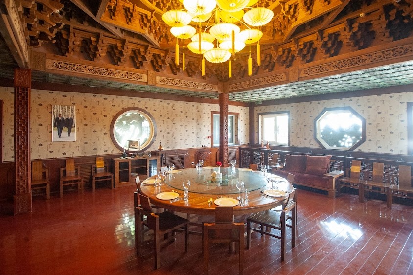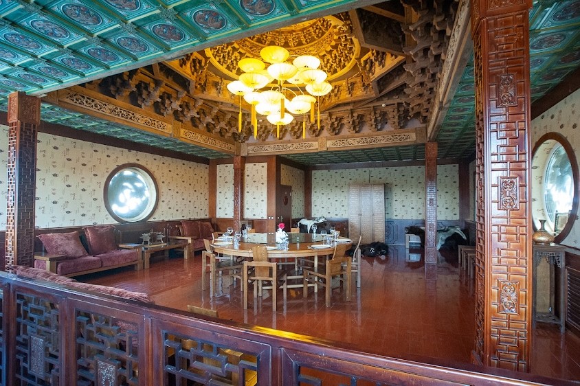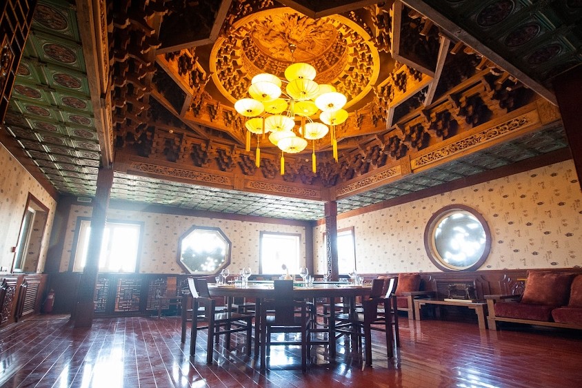 -Декорирован в традиционном китайском стиле. Украшен резьбой и своеобразным куполом. В зал ведет красивая деревянная винтовая лестница. Гордость зала - уникальная люстра